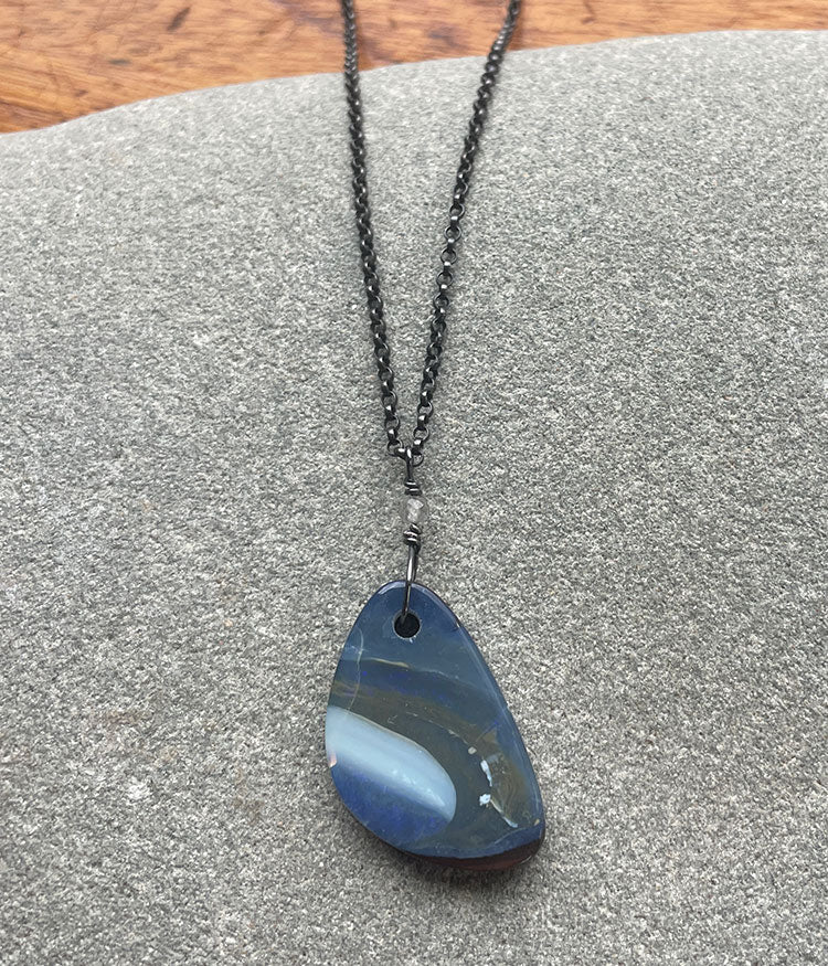 Blues and earth tones come together in this opal necklace for a truly striking look. Mined in Australia, this stone caught my eye with its natural movement and unique shape.